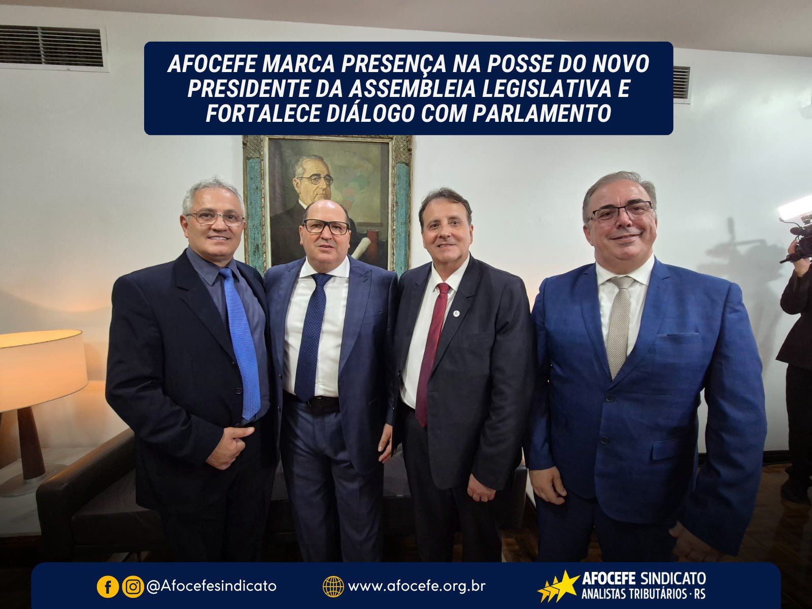 Representado pelo presidente Guilherme Campos e pelos diretores Paulo Bitencourt e Adelar Vendruscolo, o Afocefe Sindicato esteve presente, nesta terça-feira, 03, na sessão solene de eleição e posse da Mesa Diretora da Assembleia Legislativa. Com mandato até janeiro de 2027, o Parlamento será presidido pelo deputado estadual Sergio Peres (Republicanos).